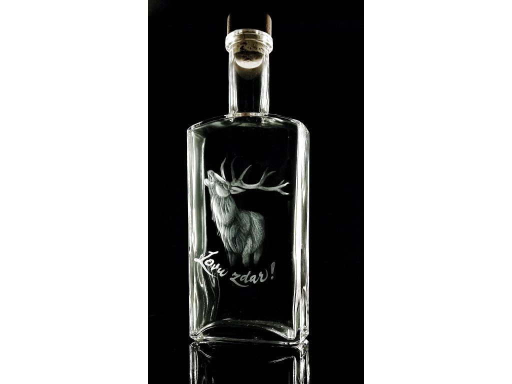 lahev na kořalku 0,5l s rytinou jelena, lovu zdar - ručně ryté (broušené) dárková krabička, dárek pro myslivce