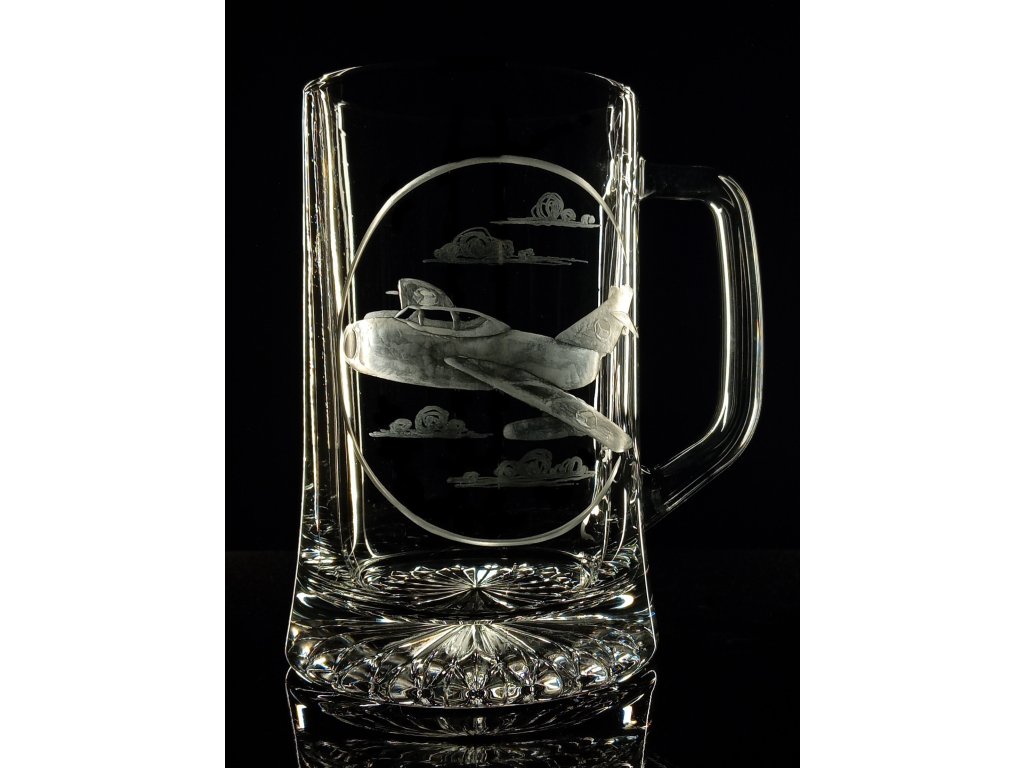 půllitr s tryskovým letadlem MIG 15 bis - ručně ryté (broušené)