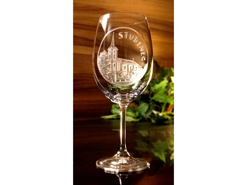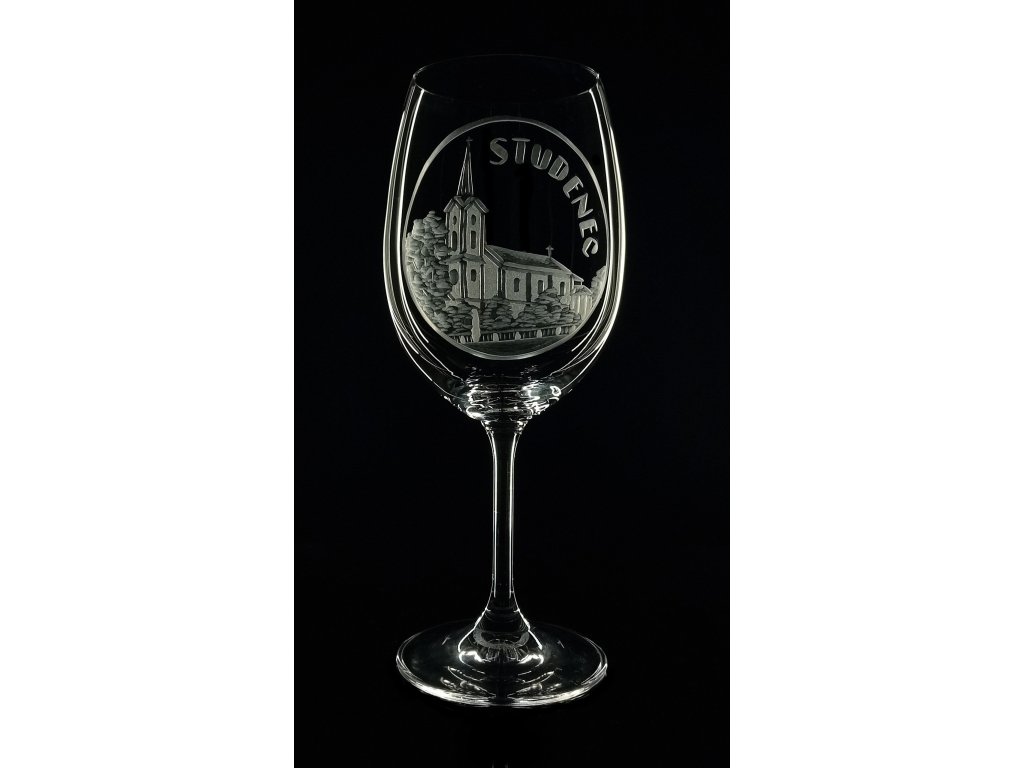 sklenice 1ks na víno Lara 450ml s rytinou kostela v obci Studenec - ručně ryté (broušené) dárková krabička